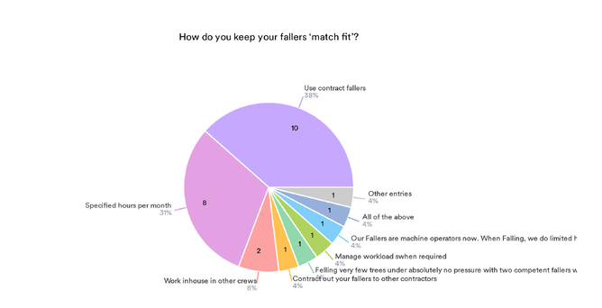 A question that has become very topical in the last few years as mechanisation has increased is ‘How do you keep your manual tree fallers match fit?’ 38% of respondents use contract fallers, 31% use specified hours per month, 8% work inhouse in other crews, 4% contract their fallers out to other contractors.