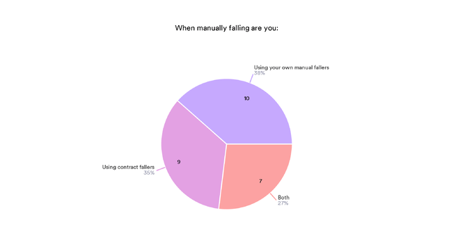 When manual falling 38% were using their own fallers, 35% using contract fallers and 27% using both. This indicates that there is a significant use of contract fallers used in the industry.
