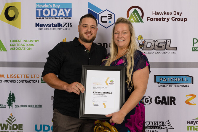For your part in supporting training with exceptional mahi, we are very happy, and humbled to Belinda and Kevin Humphries at General and Protection Forestry Services and Ground up Forestry with this Special Award Growing Talent. Congratulations.