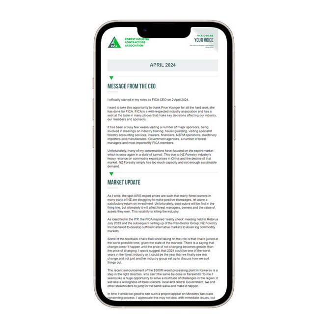 It has been a busy few weeks visiting a number of major sponsors, being involved in meetings on industry training, hauler guarding, visiting specialist forestry accounting services, insurers, financiers, NZFM operations, machinery importers and manufactures, Government agencies, a number of forest managers and most importantly FICA members.