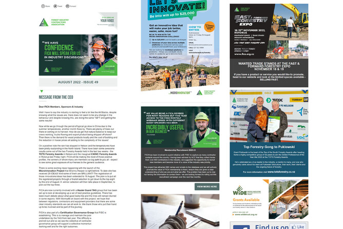 On a positive note the rain has stopped in Nelson and the temperatures have been pretty oustanding in the North Island. There have been some awesome results come out of the two Forestry Awards held in the last two weeks - the TOTS Forestry Awards in Nelson and the inaugrual CNIWC Forestry Awards in Rotorua last Friday night. FICA will be making the most of those positive profiles, the winners of whom many are members so big awhi to you all - expect to see some great exposure of our heroes to the general audience.