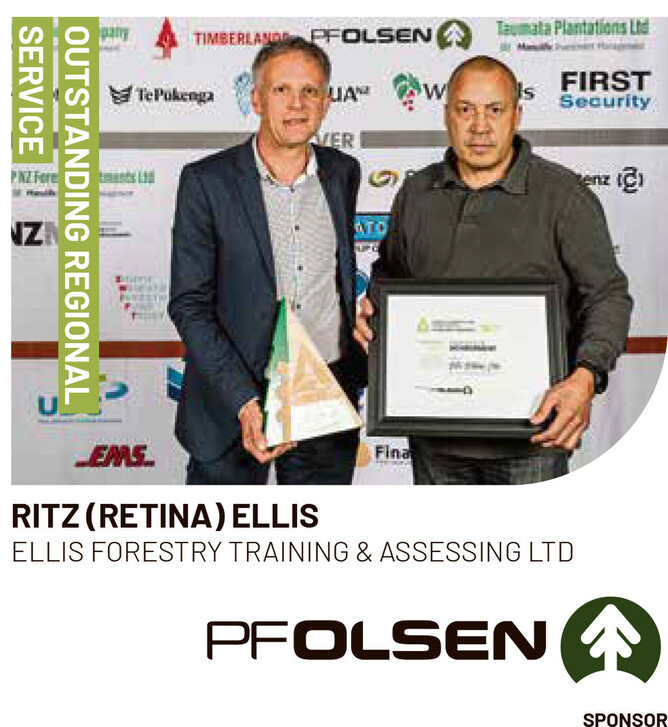 Ritz (Retina) Ellis – Ellis Forestry Training & Assessing Limited has won the Outstanding Regional Service Award at the 2022 Central North Island Wood Council Awards.